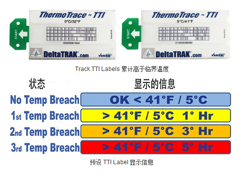 DeltaTrak 的冷藏鏈解決方案包括 ThermoTrace TTI 標(biāo)簽和 ThermoTrace TTI 服務(wù)。TTI 標(biāo)簽是一個低成本的一次性的條碼標(biāo)簽,,支持各種預(yù)定的時間和溫度。基于驗證的 (無毒) 化學(xué)過程,條碼會由跟蹤三個不同水平的溫度變化累積而改變。這個動態(tài)過程在每次條碼掃描時被實時地記錄。 購買標(biāo)簽,,但沒有訂購 ThermoTrace TTI 服務(wù)的客戶只會收到掃描儀上預(yù)先配置的反饋消息。也不會收到通過電子郵件或短信文本的任何警報消息。 DeltaTrak 目前提供兩個標(biāo)簽型號。型號 55100 0 ° C 臨界溫度和型號 55101 臨界溫度 5 ° C 。 標(biāo)簽的設(shè)計旨在改變條碼讀數(shù)當(dāng)三個不同累計溫度發(fā)生變化時。在任何時間點有只有一個有效的條碼。 對于 0 ° C 臨界點標(biāo)簽,第一次改變發(fā)生時產(chǎn)品應(yīng)該已經(jīng)經(jīng)歷了 2 小時以上的 0 ° C,第二次在 4 小時和 最后6 小時的變化。此標(biāo)簽通常會用于冷凍的商品,,如肉類、 海鮮或要求低溫儲存的雞。 臨界溫度 5 ° C 的標(biāo)簽跟蹤在產(chǎn)品經(jīng)歷高于5 ° C 的累計時間。 標(biāo)簽條形碼第一次在1 個小時后改變,其后,在 3 個小時和最終 5 小時。 此標(biāo)簽通常用于的商品包括貨物、 化學(xué)品或能承受稍高溫度的藥品等。