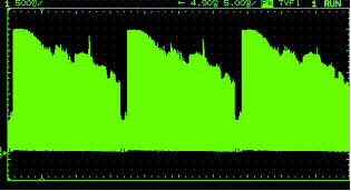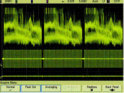 圖2是無Z軸亮度調(diào)制較老數(shù)字示波器的顯示。雖然該示波器甚至在5ms/div時(shí)仍有捕獲信號(hào)細(xì)節(jié)的足夠采樣率和存儲(chǔ)器深度但所有捕獲點(diǎn)的顯示亮度相同。這就在視覺上丟失了信號(hào)包絡(luò)內(nèi)的波形細(xì)節(jié)。因此在選擇模擬示波器技術(shù)還是選擇較老的數(shù)字顯示技術(shù)上不應(yīng)對(duì)今天視頻實(shí)驗(yàn)室中充斥模擬示波器感到驚奇!