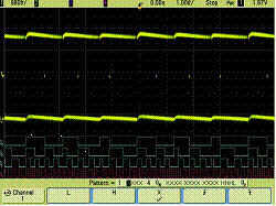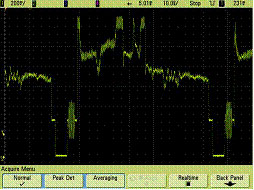 復(fù)雜模擬信號(hào)的另一例子是數(shù)字控制馬達(dá)驅(qū)動(dòng)信號(hào)。馬達(dá)不同時(shí)間的起動(dòng)周期可歸入單次現(xiàn)象。圖5示出采用高分辨率顯示技術(shù)的示波器如何可靠捕獲單次起動(dòng)馬達(dá)驅(qū)動(dòng)信號(hào)的一相。您也能用混合信號(hào)示波器的數(shù)字∕邏輯通道同步和觸發(fā)對(duì)基于馬達(dá)數(shù)字控制信號(hào)的波形捕獲。在您試圖同步對(duì)開機(jī)序列或是對(duì)特定馬達(dá)定位命令的采集時(shí)這一能力是極端重要的。雖然圖中沒有示出但該示波器能使用它的4個(gè)模擬采集通道容易地同時(shí)捕獲馬達(dá)驅(qū)動(dòng)信號(hào)的所有三相。