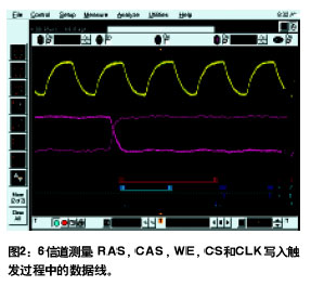 如圖2所示16條邏輯定時信道用來設(shè)置在RAS高、CAS低、WE高和CS上觸發(fā)系統(tǒng)。示波器信道1用來察看和抽換法時鐘的上升沿。在邏輯分析儀和示波器組合解決方案中邏輯分析儀只能交叉觸發(fā)示波器或反之與此不同混合信號示波器可以在示波器和邏輯定時信道中進(jìn)行全寬觸發(fā)。