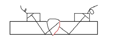 圖 1 對接焊焊縫余高未磨平、只能單面探測?墒褂眯碧筋^、觀察一次或二次回波在焊縫兩側進行掃查探傷。