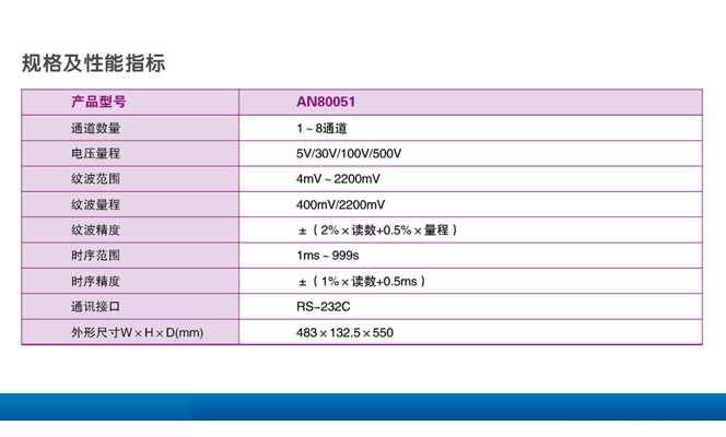 產(chǎn)品簡(jiǎn)介 AN80051多通道時(shí)序紋波測(cè)量?jī)x具有直流電壓紋波和時(shí)序測(cè)試功能,,主要應(yīng)用于各種家電電源、適配器和各種開(kāi)關(guān)類(lèi)電源的時(shí)序測(cè)試。