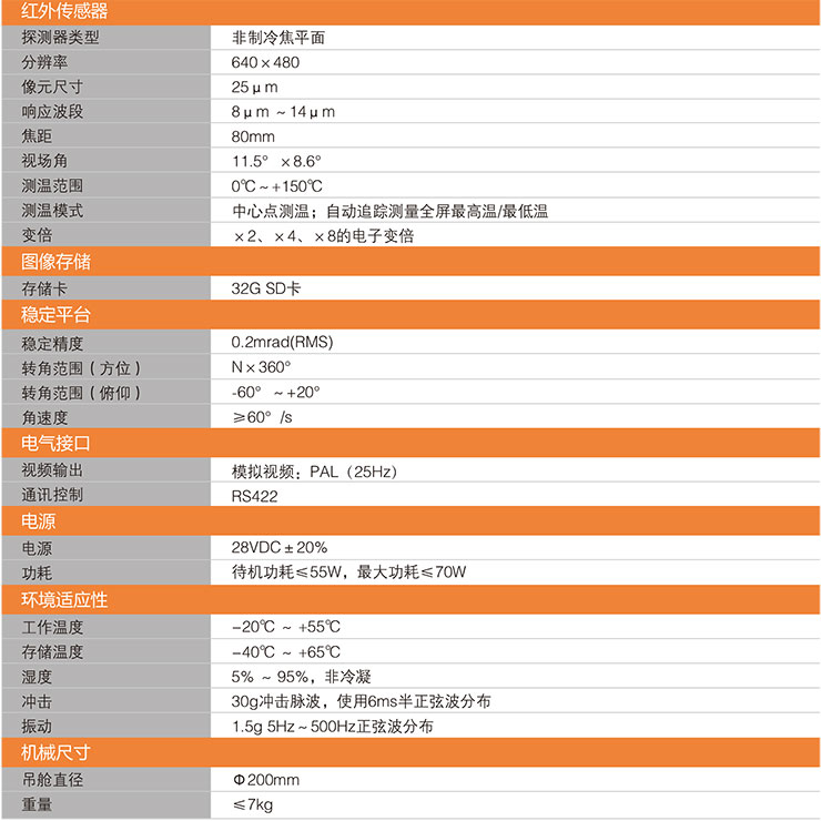 產(chǎn)品特點(diǎn) 體積小重量輕 直徑200mm,紅外熱成像儀價(jià)格,重量7kg,大大降低飛機(jī)有效負(fù)荷 640x480高分辨率紅外熱成像儀 分辨率高,可清晰分辨出輸電線路發(fā)熱故障點(diǎn) 跟蹤精度高穩(wěn)定性好 采用陀螺穩(wěn)定平臺(tái),意大利紅外熱像儀,可有效隔離運(yùn)動(dòng)載體的各種振動(dòng)、起伏、 顛簸,醫(yī)學(xué)紅外熱像儀,消除圖像的模糊和晃動(dòng) 視頻實(shí)時(shí)回傳 高空視頻可實(shí)時(shí)回傳至地面指揮中心,紅外熱像儀成像,提高巡線效率 可拍照錄像 配置32G內(nèi)存卡,車(chē)載紅外熱像儀,可對(duì)觀測(cè)點(diǎn)拍照錄像,夜視紅外熱像儀,便于地面對(duì)故障進(jìn)行分析 提供標(biāo)準(zhǔn)的通訊接口 標(biāo)準(zhǔn)的通訊接口,方便與無(wú)人機(jī)、直升機(jī)等載體通訊,手持式紅外熱像儀,安裝調(diào)試方便
