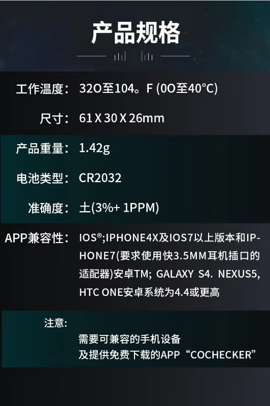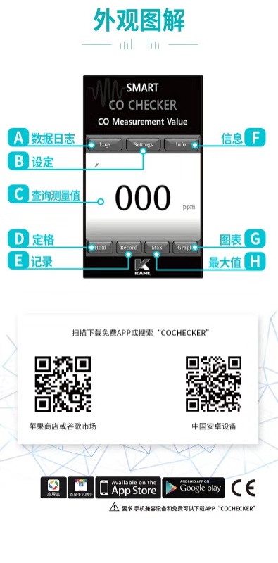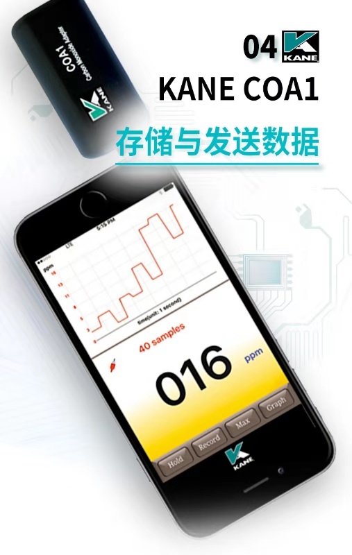英國KANE凱恩手機(jī)銜接一氧化碳探測儀 KANE COA1 一氧化碳探測儀 手機(jī)銜接解決方案 • 可探測一氧化碳至1ppm • 一氧化碳讀取至999ppm • 與iOs或安卓系統(tǒng)兼容 • 可在免費(fèi)APP上顯示3個(gè)危險(xiǎn)等級 • APP上可以保存數(shù)據(jù)和發(fā)送郵件數(shù)據(jù) • 工作溫度:32O至104℉(0O至40℃) • 準(zhǔn)確度:±(3%+1PPM