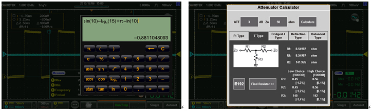 GDS-300/GDS-200系列示波器內(nèi)建多樣化的應(yīng)用軟件以提供使用者極為貼心的輔助工具。在繁瑣的電路設(shè)計當中,工程計算機軟件可提供簡易到進階的數(shù)學(xué)計算功能,讓工程師能夠徹底地了解電路的響應(yīng)以及參數(shù)表現(xiàn)值。衰減器計算軟件不僅提供衰減值計算的功能,亦提供在不同的衰減模型下,該具備的各項元件參數(shù)數(shù)值。電阻值計算軟件,可以根據(jù)不同的表面鑲嵌式電阻代碼提供正確的阻值外,亦提供色碼電阻阻值的查詢功能,對于初學(xué)的學(xué)生到資深的電子工程師皆是一向強大的輔助利器。