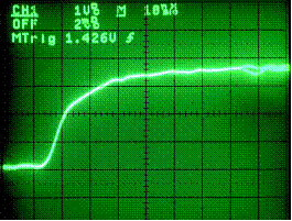 圖9是在模擬示波器上顯示的同樣信號。我們在這里不能示出抖動沿因為它產(chǎn)生在觸發(fā)參考點(diǎn)(上升沿)之前。但能觀察到信號沿有時產(chǎn)生間歇毛刺。我們不能用模擬示波器觀察毛刺因為對常規(guī)模擬示波器顯示而言它出現(xiàn)次數(shù)太少即使把顯示亮度調(diào)到最亮。