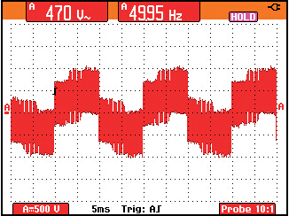 50 Hz馬達(dá)驅(qū)動(dòng)輸出電壓的脈寬調(diào)制信號(hào)的細(xì)節(jié)。1000V,50 微秒的脈沖即導(dǎo)致某些測(cè)試設(shè)備的不穩(wěn)定。