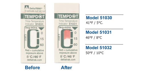 DeltaTrak提供滿足你各種需要的標(biāo)簽:WarmMark溫度標(biāo)簽、高溫?zé)針?biāo)簽和TempDot時(shí)間溫度指示標(biāo)簽顯示溫度變 化超過預(yù)設(shè)的時(shí)間。FreezeCheck和ColdMark溫度標(biāo)簽用于顯示運(yùn)輸溫度低于0℃。商業(yè)洗碗機(jī)使用的TempDot高溫?zé)針?biāo)簽可顯示最終沖 洗水溫是否達(dá)到71℃(HACCP體系所要求的溫度)。 TempDot時(shí)間溫度標(biāo)簽,,型號51030-51032,,是一種低成本的標(biāo)簽,,可顯示溫度高于閾值長達(dá)60分鐘。當(dāng)溫度超過臨界值,,標(biāo)簽顏色變化開始,,但溫度下降到閾值之下時(shí),,標(biāo)簽顏色變化停止,,如此來顯示累積溫度超過的時(shí)間-,,對于許多質(zhì)保應(yīng)用來說,度分鐘是非常的重要的概念。有三種溫度閾值5℃、8℃和10℃可供選擇。 這個(gè)低成本標(biāo)簽可以指示一段長到60分鐘暴露在臨界點(diǎn)溫度。