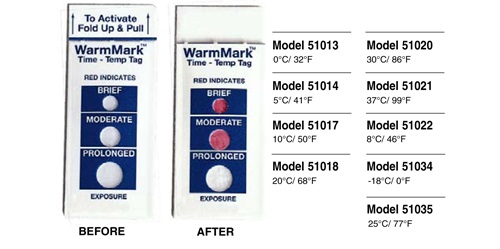 溫度指標標簽是體積小、成本低的溫度指示標簽或時間/溫度標簽,,使用于食品運輸、儲存或處理過程。典型的用途包括監(jiān)測藥品、化學品和新鮮農(nóng)產(chǎn)品在運輸過程中德溫度。如果溫度超出預設的限制之外,,標簽顯示變色。 DeltaTrak提供滿足你各種需要的標簽:WarmMark溫度標簽、高溫熱標簽和TempDot時間溫度指示標簽顯示溫度變 化超過預設的時間。FreezeCheck和ColdMark溫度標簽用于顯示運輸溫度低于0℃。商業(yè)洗碗機使用的TempDot高溫熱標簽可顯示最終沖 洗水溫是否達到71℃(HACCP體系所要求的溫度)。 WarmMark 溫度標簽,,型號51013-51035,, 監(jiān)控產(chǎn)品在運輸、 儲存或處理過程中的溫度。反應溫度范圍可從-18℃至37℃。這些不干膠標簽直接適用于產(chǎn)品、包裝、紙箱或大包裝上。一旦反應溫度達到或超過,,標簽便被激 活而發(fā)生不可逆變色。紅色顯示溫度的閾值外暴露經(jīng)過了一個短暫,,中等或長久的時間段。你一眼便能看出是否有溫度閾值外暴露發(fā)生,,提供質(zhì)量保證的永久記錄。