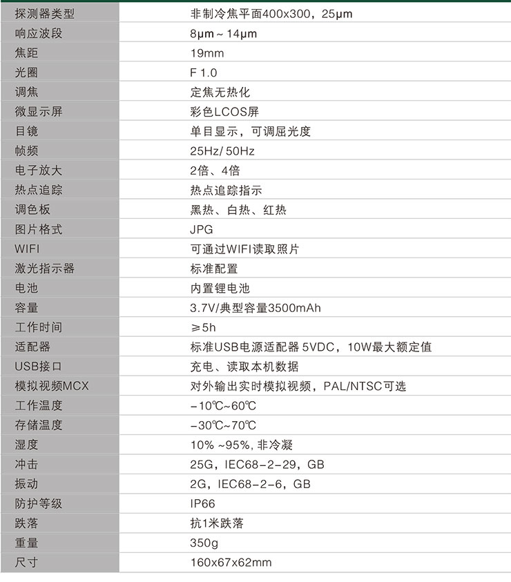 產(chǎn)品特點(diǎn) 可拍照,法國(guó)紅外熱像儀,并通過WIFI分享所拍攝照片,熱像儀,方便多人同時(shí)瀏覽 直觀的按鍵功能操作,防爆紅外熱像儀,無需培訓(xùn),紅外熱像儀 報(bào)價(jià),符合人體工學(xué)設(shè)計(jì),長(zhǎng)期使用依 舊舒適 超靜音和防漏光設(shè)計(jì),國(guó)產(chǎn)紅外熱像儀,使用時(shí)不暴露自身 內(nèi)置式鋰電池,5小時(shí)超長(zhǎng)電池使用時(shí)間,并可外接便攜電源持續(xù)使用 標(biāo)準(zhǔn)Micro USB充電接口,新一代紅外熱像儀,適應(yīng)多種充電方式(適配器/車載點(diǎn)煙器/電腦/充 電寶) 激光指示器可用于目標(biāo)指示 IP66超強(qiáng)防護(hù)等級(jí),抗1米跌落,適應(yīng)野外使用環(huán)境